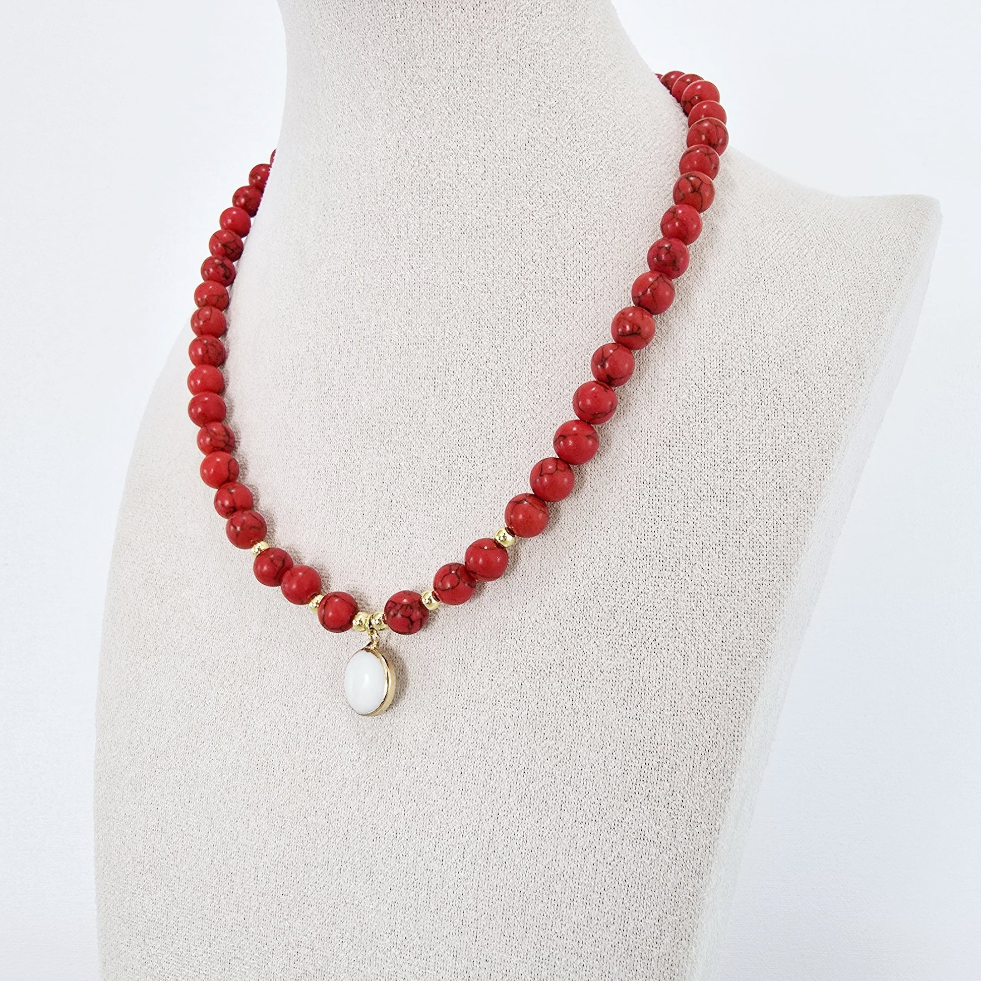 Elegante collar de piedras de turquesa roja, con cuentas y broche de acero bañados en oro, y un dije de concha natural de agua dulce chapado en oro de 18k. El diseño moderno y bohemio es perfecto para resaltar tu estilo.
