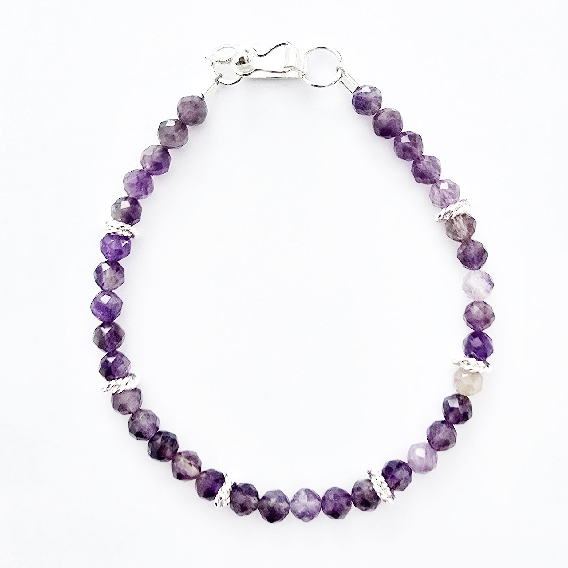 Pulsera elaborada con amatistas facetadas de 4 mm y detalles en plata 950. Su diseño ligero y brillante irradia energía espiritual, ideal para quienes buscan equilibrio y elegancia en una pieza discreta pero poderosa.