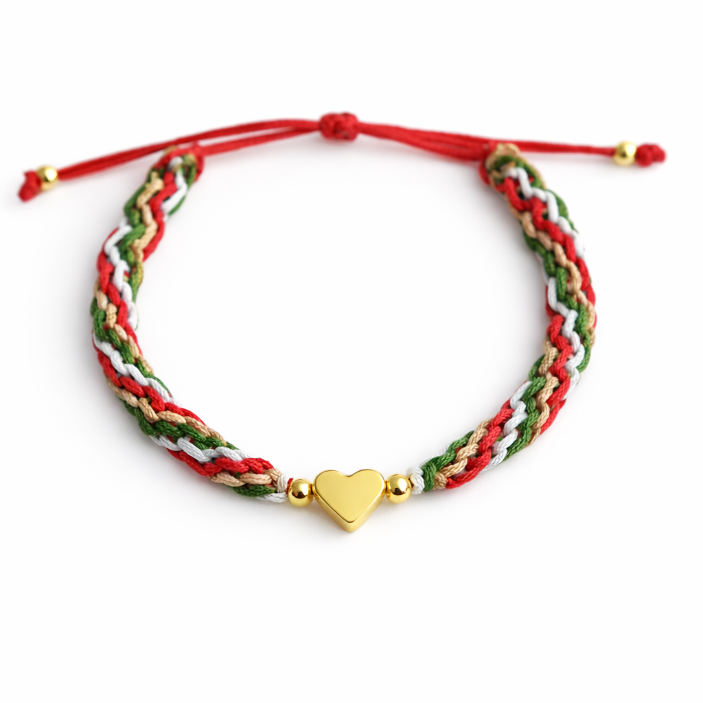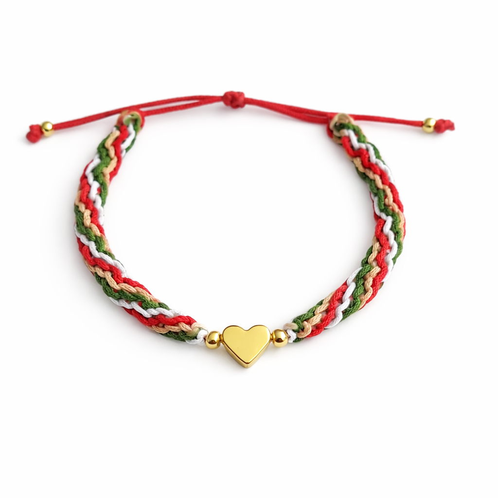 Materiales: Hilo rojo, verde, plata y beige, dije de corazón y cuentas en acero quirúrgico con baño en color dorado.