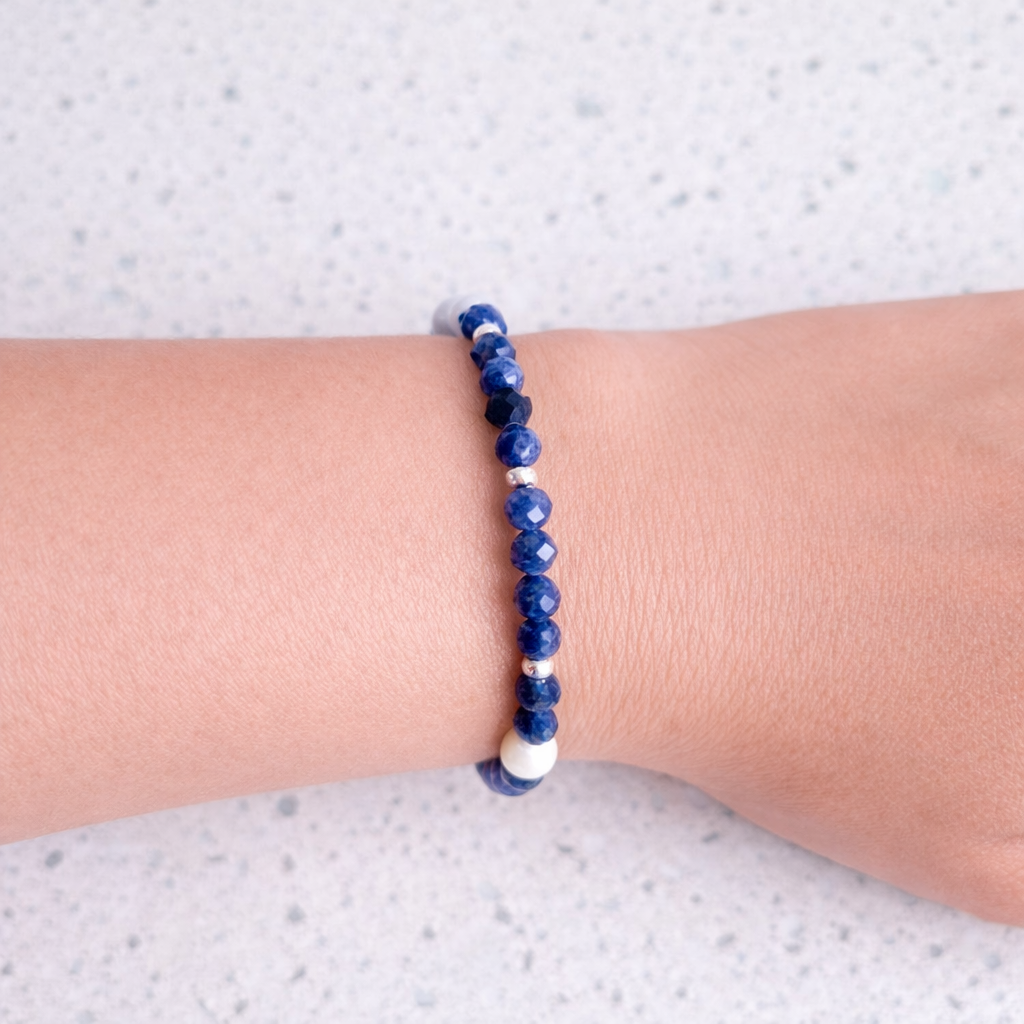 Pulsera de sodalita facetada en tonos azul profundo, combinada con perlas de agua dulce que aportan un toque elegante y sofisticado, y accesorios de plata 950, ideal para quienes buscan un accesorio sutil pero con personalidad.